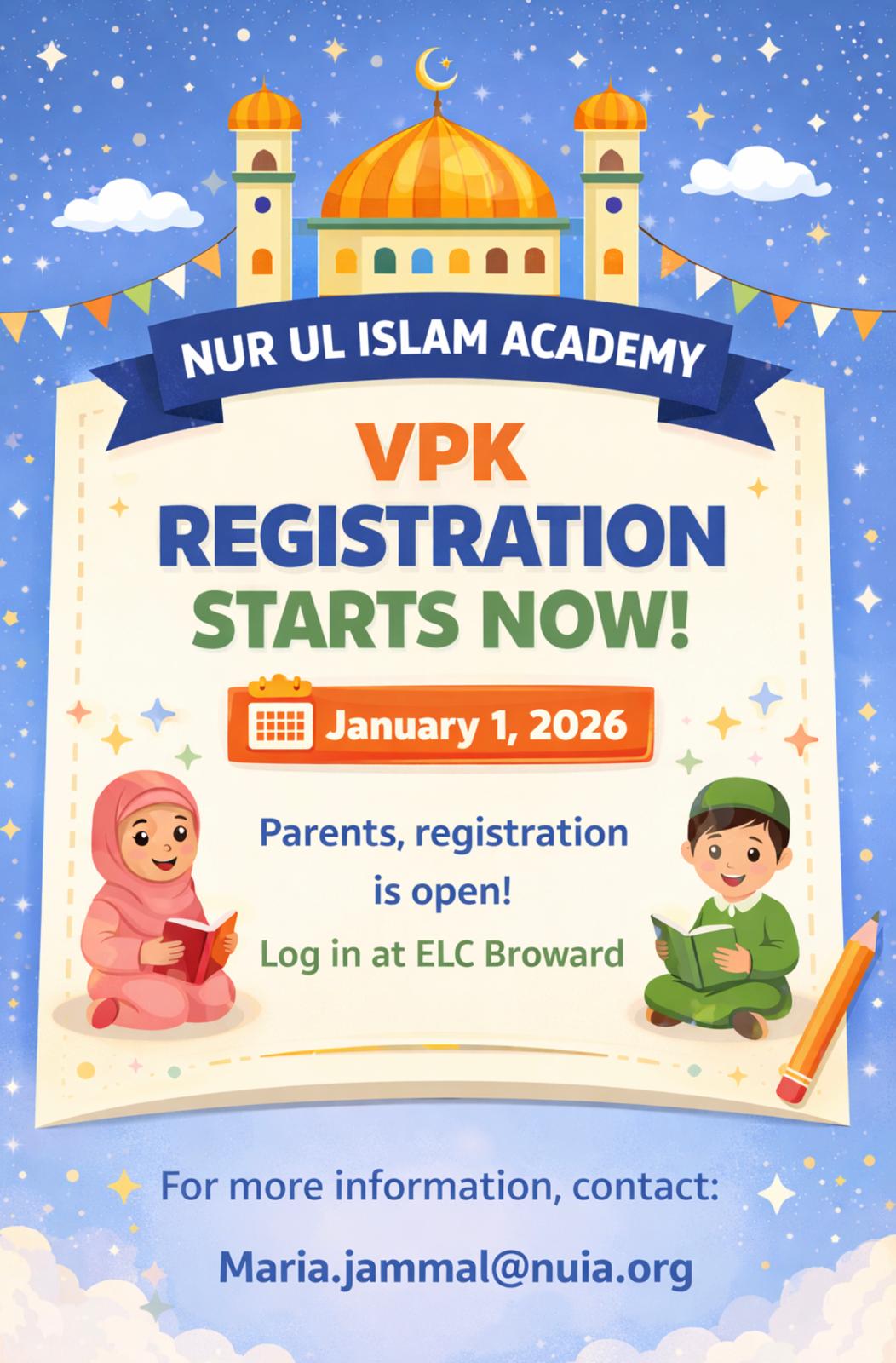 Nur-Ul-Islam Academy is an Islamic school that encompasses Pre-K through Grade 12. It is fully accredited by the Southern Association of Colleges and Schools and Florida Council of Independent Schools. Our school seeks to provide a safe, structured environment with an emphasis on the values embodying faith, family, and education. We invite you to explore our admissions pages and to contact our admissions personnel, Mrs. Ayesha Hack or Mrs. Sahar Murad at 954-434-3288.